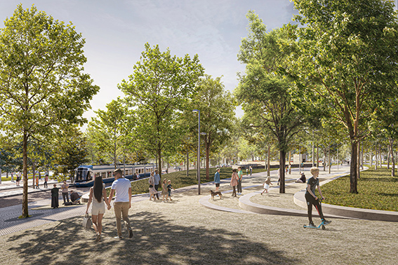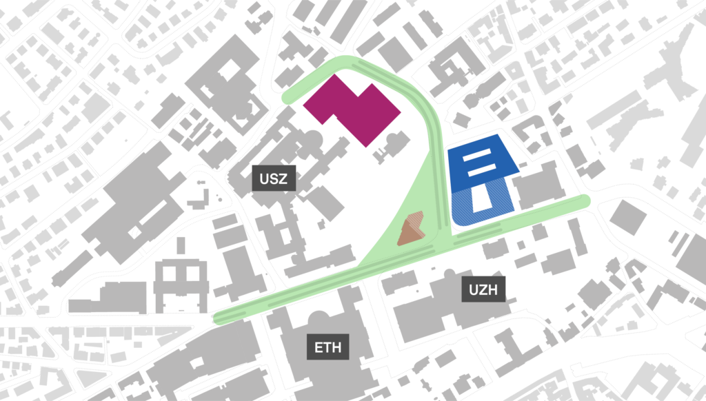 Der heutige Parkplatz des USZ wird als Aufenthaltsraum mit zahlreichen Bäumen, Wiesenflächen und Wegverbindungen zur sogenannten Parkschale umgestaltet.